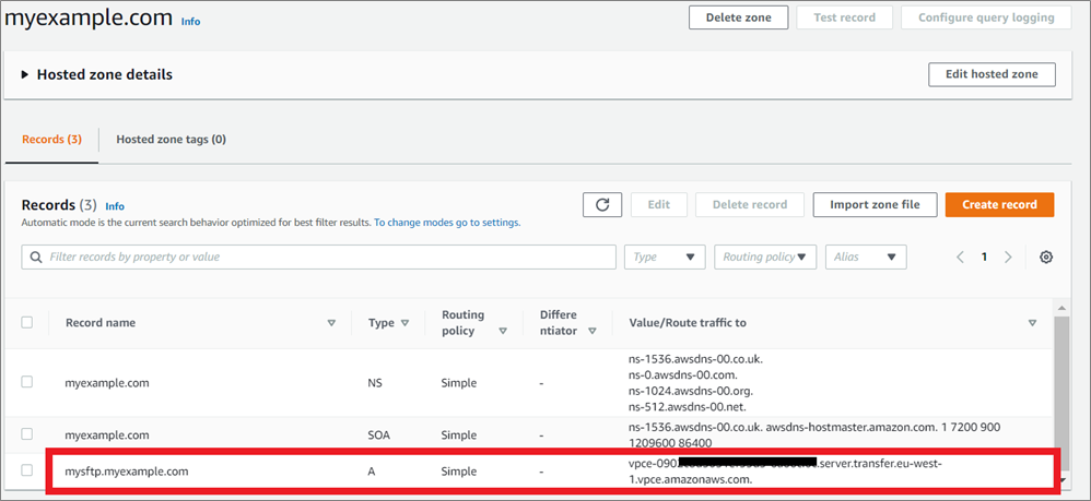 Figure 7 – Amazon Route 53 record for SFTP server.