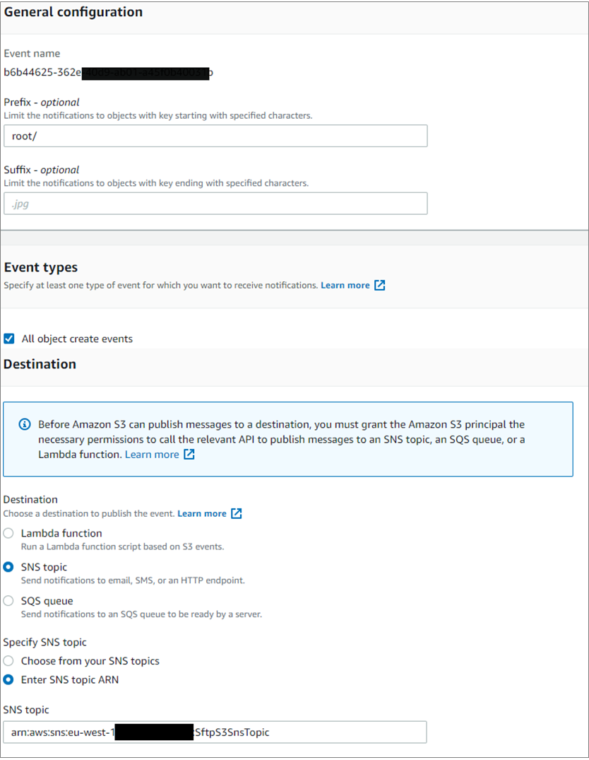 Finally, set a notification configuration so that every time a new file is put in the root folder, it publishes a message in an SNS topic. This is described later in the Automation section of this post.