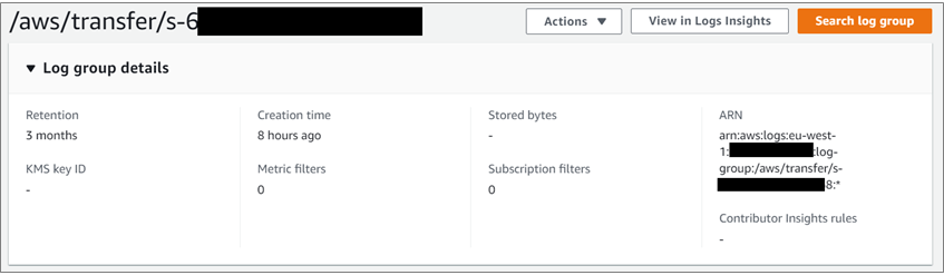 Finally, we create the Amazon CloudWatch Log Group where AWS Transfer Family will be able to push the connection logs with the AWS Identity and Access Management (IAM) role and policy to allow AWS Transfer Family to do it.