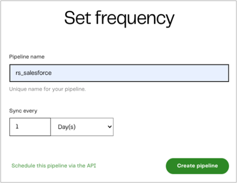 The final step is to set the frequency of your batch runs. You can choose a minimum of every five minutes or a maximum of once every seven days. Simply select your desired frequency and click on Create pipeline.