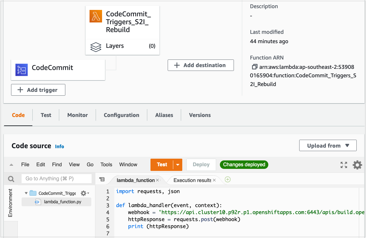What we just saw in the previous section is still manual. The goal is to automate the build process, such that AWS CodeCommit can invoke the webhook URL and notify the OpenShift BuildConfig automatically. There are several ways to address this, but for simplicity we are going to use AWS Lambda to invoke the hardcoded webhook URL.