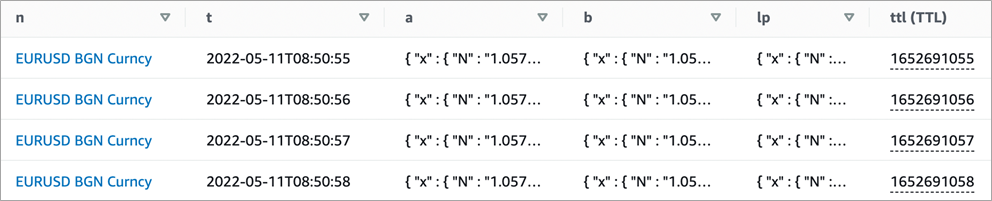 Figure 2 – Ticker items in DynamoDB with the ticker name (n) and timestamp (t) as primary key. Other fields represent ask (a), bid (b), and last price (lp).