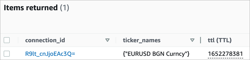 Whenever a new market data update ticks, the appropriate values are re-calculated. The service then looks at the list of subscribers to figure out which subscribers are interested in the update. The list of subscribers is stored in DynamoDB, keyed by the connection ID with a set of ticker names.
