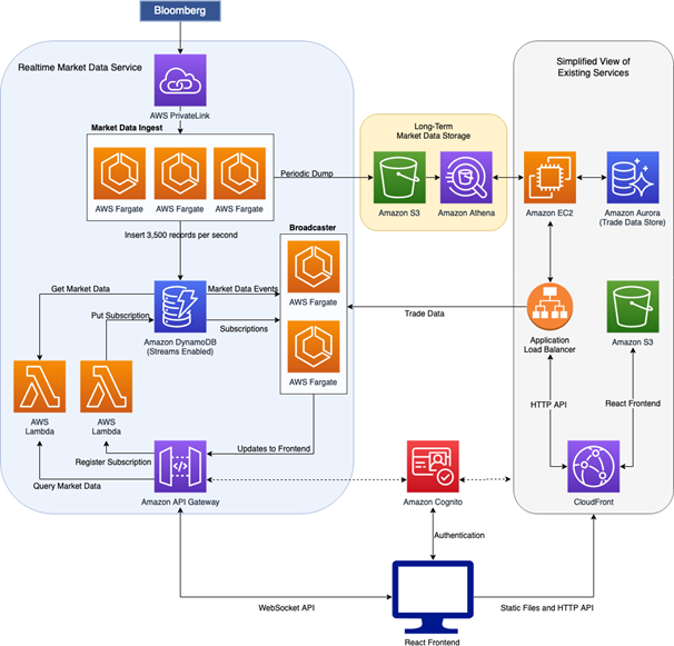 In this post, we explore how Validus, leveraging B-PIPE and AWS PrivateLink, was able to implement a Proof-of-Concept (PoC) feed in a week, empowering their team to scale to production loads. The proposed solution propagates real-time updates from Bloomberg, all the way to the React frontend of the RiskView platform.