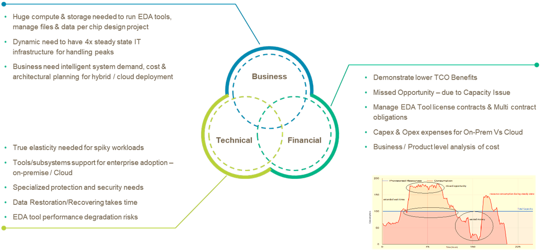 The needs at each phase of the chip design lifecycle are also quite varied. Some EDA workloads are compute-intensive, whereas some are memory intensive or both. This spiky nature and the ever-changing elastic demands make EDA design ideally suited for the cloud.