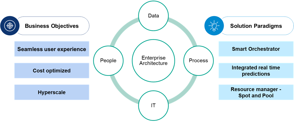 The following diagram summarizes solution paradigms required to address business objectives, along with the process and design challenges described in the previous section.