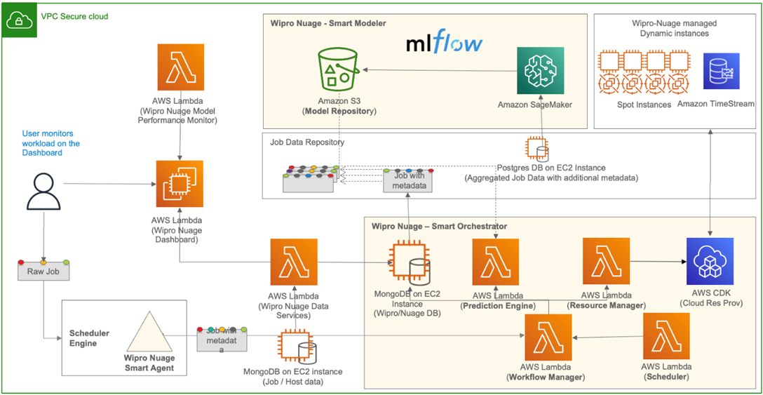 Wipro-Nuage automates the process of identifying the right resource requirements and ensures that only the right amount of compute or memory resources are reserved during the process of electronic design automation. It uses Amazon SageMaker to build, train, and deploy machine learning (ML) models that help in identifying the right data size.