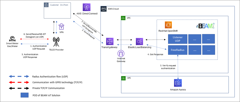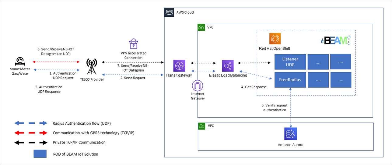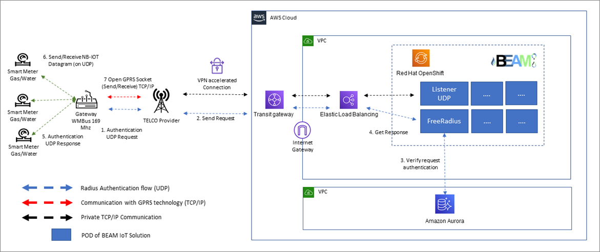 In this case, the meters communicate with a WMBus Gateway, which acts as a centralizer. The authentication flow begins with a UDP authentication request (1), which is forwarded by the telco provider (2) to FreeRadius instance running on BEAM. The Amazon Aurora database is used to verify the request (3).