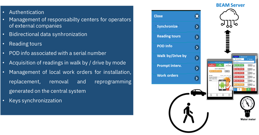 The BEAM IoT solution covers the entire cycle of “remote reading” (acquisition of readings, events, alarms, and telemetry coming from the field) and “remote management” (cycle of work orders for ordinary and extraordinary management).