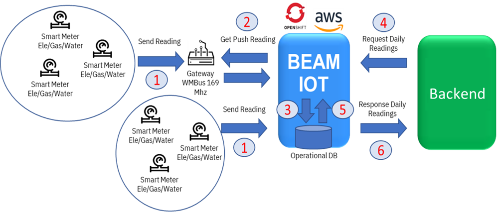 Another example is the BEAM IoT capability of managing smart-meters, or meters equipped with additional sensors such as detection of oscillations, vibrations, or pressure. BEAM IoT can acquire and manage information from these sensors and enable use cases such as sending notifications of environmental events (seismic shocks) or related to the property, like volumetric and perimeter alarms.