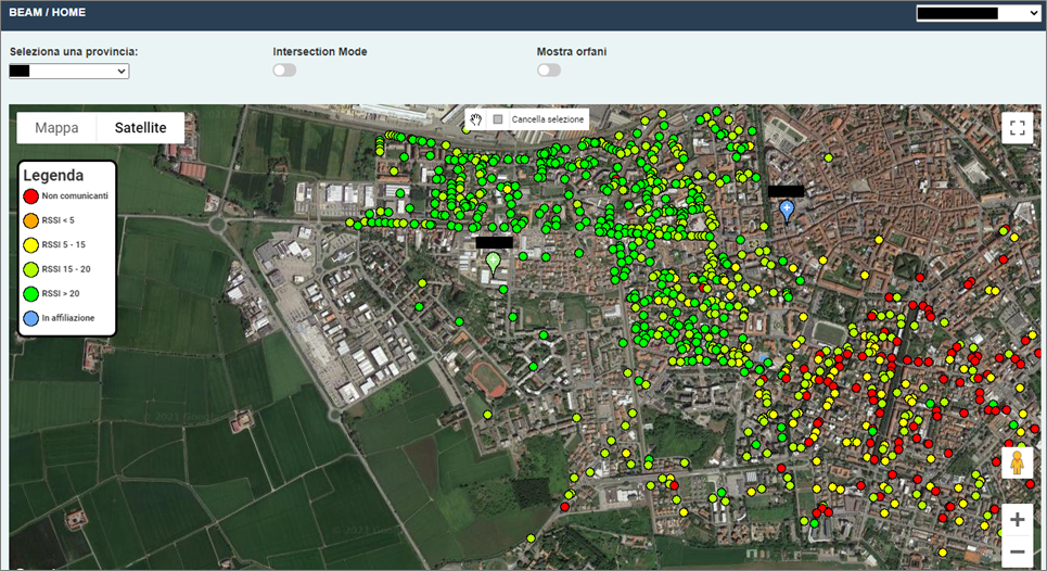 In this example, you can see how the meters (red dots) in the lower right have lower quality communication with respect to the meters in the rest of the map; this is due to the greater distance from gateways under which meters are affiliated.