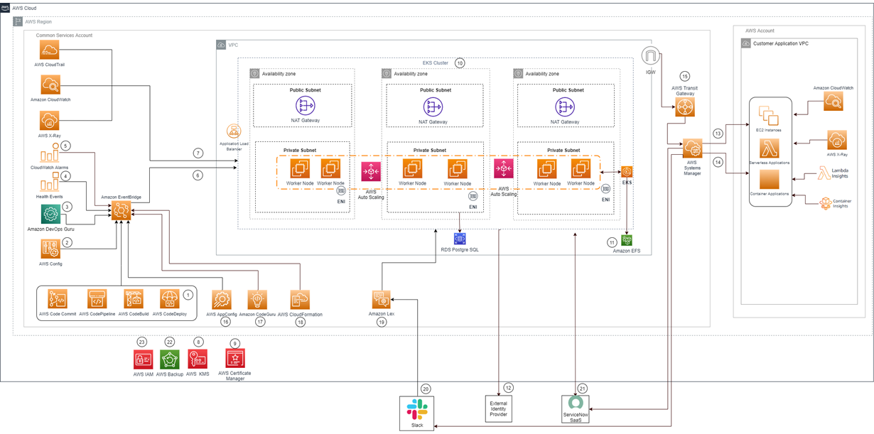- Infrastructure and application lifecycle events using AWS-native DevOps toolchain are integrated and hosted on Amazon Elastic Kubernetes Service (Amazon EKS) using Amazon EventBridge.