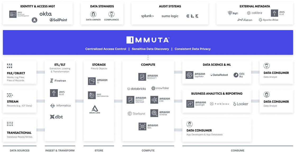 Immuta is a universal cloud data access control platform, providing one platform to automate access control for any data, on any cloud service, across all compute infrastructure. It’s built for fast-moving DataOps environments that provides universal cloud compatibility and scalability.