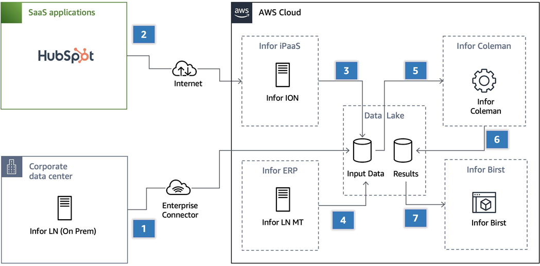 - Third-party SaaS applications like HubSpot CRM send data to Infor iPaaS using standard protocols like HTTPS.