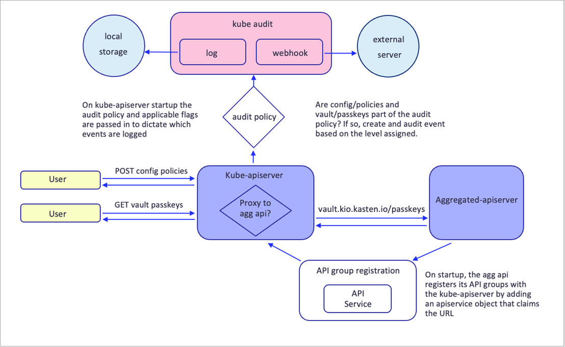 To achieve this, it leverages the Kubernetes audit logs that are generated when requests come through the kube-apiserver; these requests are made on K10 custom resources that were created via CRD’s and the Aggregated API.