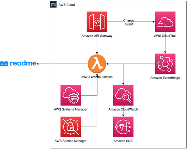 This integration implementation reacts to changes to Amazon API Gateway made manually or through a CI/CD pipeline. It synchronizes changes from the API Gateway to the developer portal in ReadMe. It does this by exporting the API Gateway OpenAPI definition and uploading changes to ReadMe.