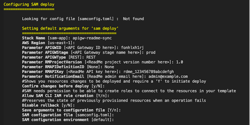- Specify stack name, synchronization source, and destination parameters (API Gateway ID, stage name, type, ReadMe project version, existing API definition ID if known or “None”, API key, notification email) and accept default values for others.