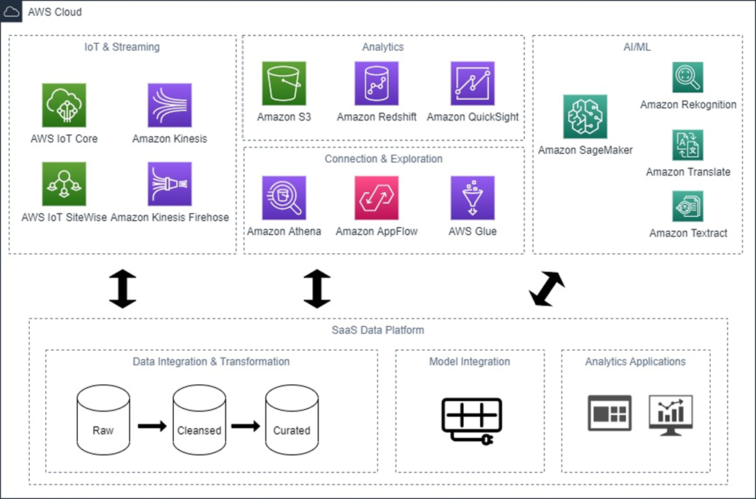 Starting from the AI/ML services, Amazon SageMaker is a powerful platform for end-to-end machine learning (ML) lifecycle, providing a fully managed infrastructure. Meanwhile, AWS AI services are pre-trained models for common use cases based on the same deep learning technology that powers Amazon.com. Integration with these services adds ML functionality to a SaaS platform with little effort, and gives data scientists a unified experience regardless of whether the data is in the SaaS platform or in another system.