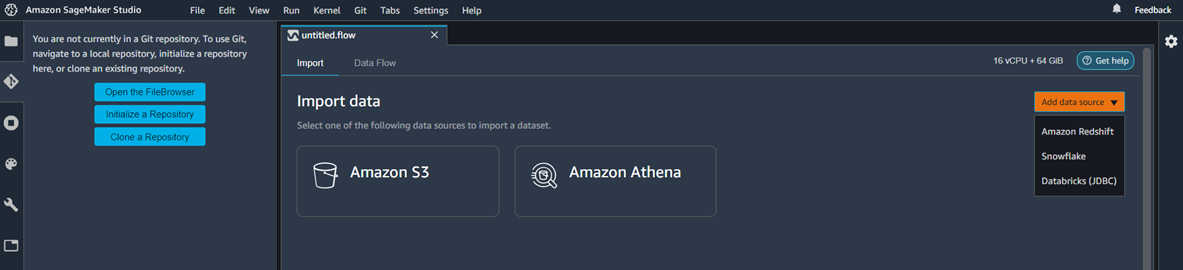 The first stage in ML model development is data preparation. Amazon SageMaker Data Wrangler simplifies this process by providing data scientists with a visual interface to select, clean, and explore their datasets. The integration from data flow directly to the SaaS platform allows data to be imported for further processing, as shown in the image below. There are a few ways in which this integration can work, including via a JDBC connection.