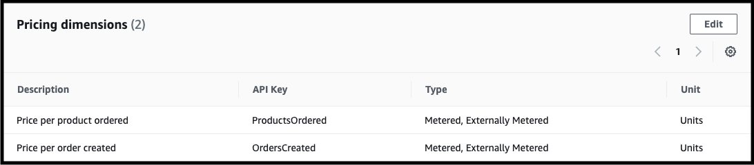 The value for this key must correlate to the pricing dimensions specified when you create your AWS Marketplace SaaS product listing. The following screenshot shows the dimensions we defined when creating our listing.