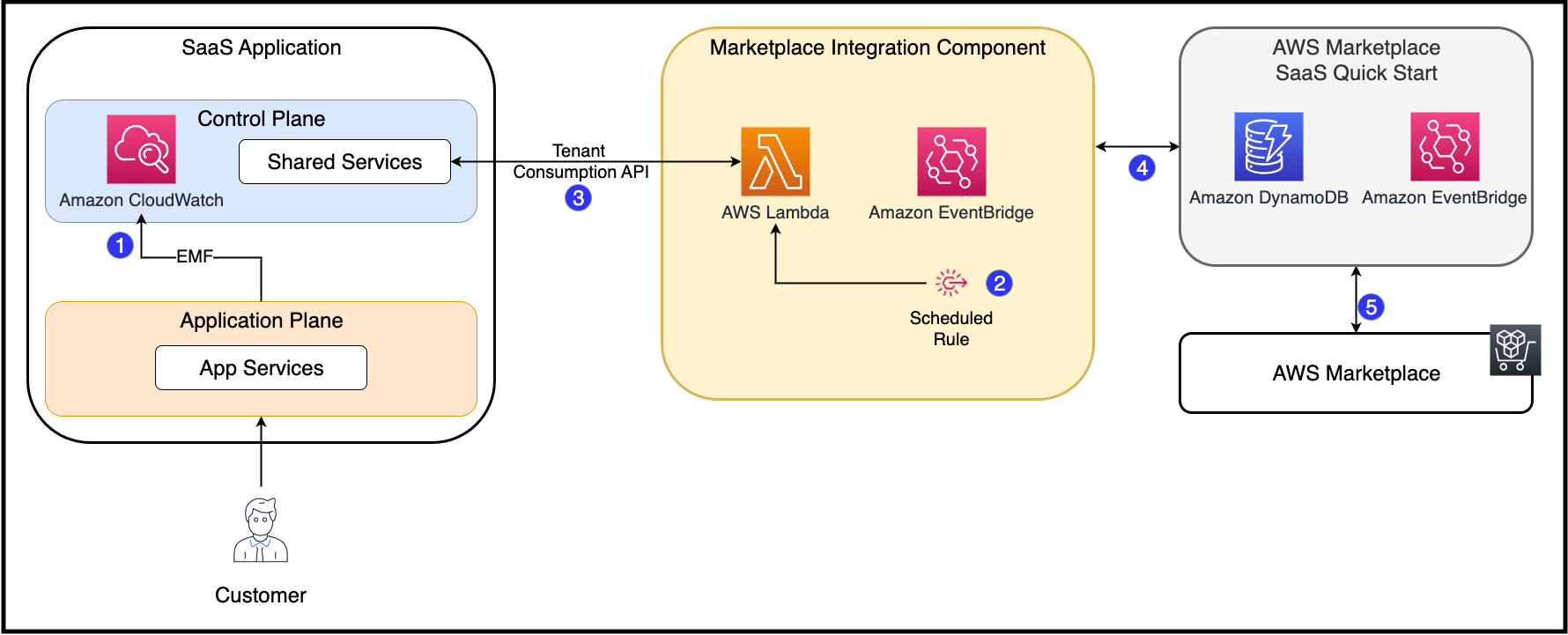 In Step 2, a scheduled EventBridge rule is fired. The target of this rule is a Lambda function with authorization to call the tenant consumption API (Step 3) in our SaaS application’s control plane.