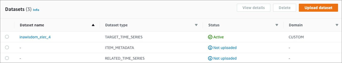 To integrate Amazon Forecast with Amazon SageMaker, you first need to create a dataset group. All that’s required is a single TARGET_TIME_SERIES file containing the data as a row-wise .csv with three columns: timestamp, item_id, and a float that’s the target of the predictor model. You can also add ITEM_METADATA and RELATED_TIME_SERIES data.