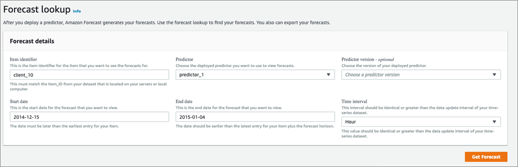 Once this is complete, you can train a predictor that can predict for up to one-third the duration of your dataset, with predictions starting for the time periods just after your dataset ends.