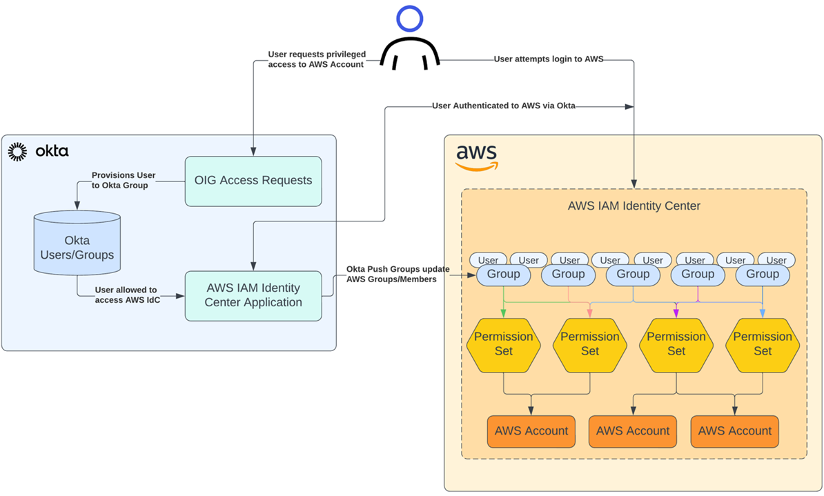 Okta’s integration with IAM Identity Center enables customers to use their Okta identities to access AWS by provisioning Okta users and groups which are assigned to AWS accounts via permission sets. Okta Access Requests are used to assign membership to these groups for a limited time only after an approval.