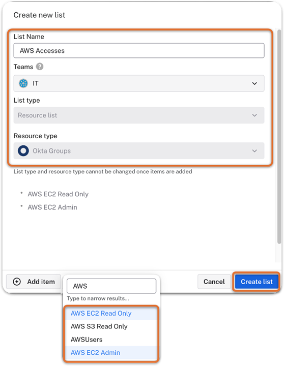 Before creating this workflow in Okta Access Requests, you need to first configure an Okta resource list. This allows your team to control the specific options available to users as a request gets processed. After that, you can configure the Access Request, including the resource list as an option.