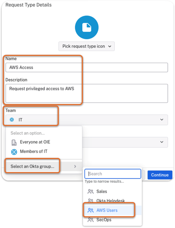 - Team: Select the Access Request Team you’d like to have administered these requests. For this example, you can use the default team: IT.
