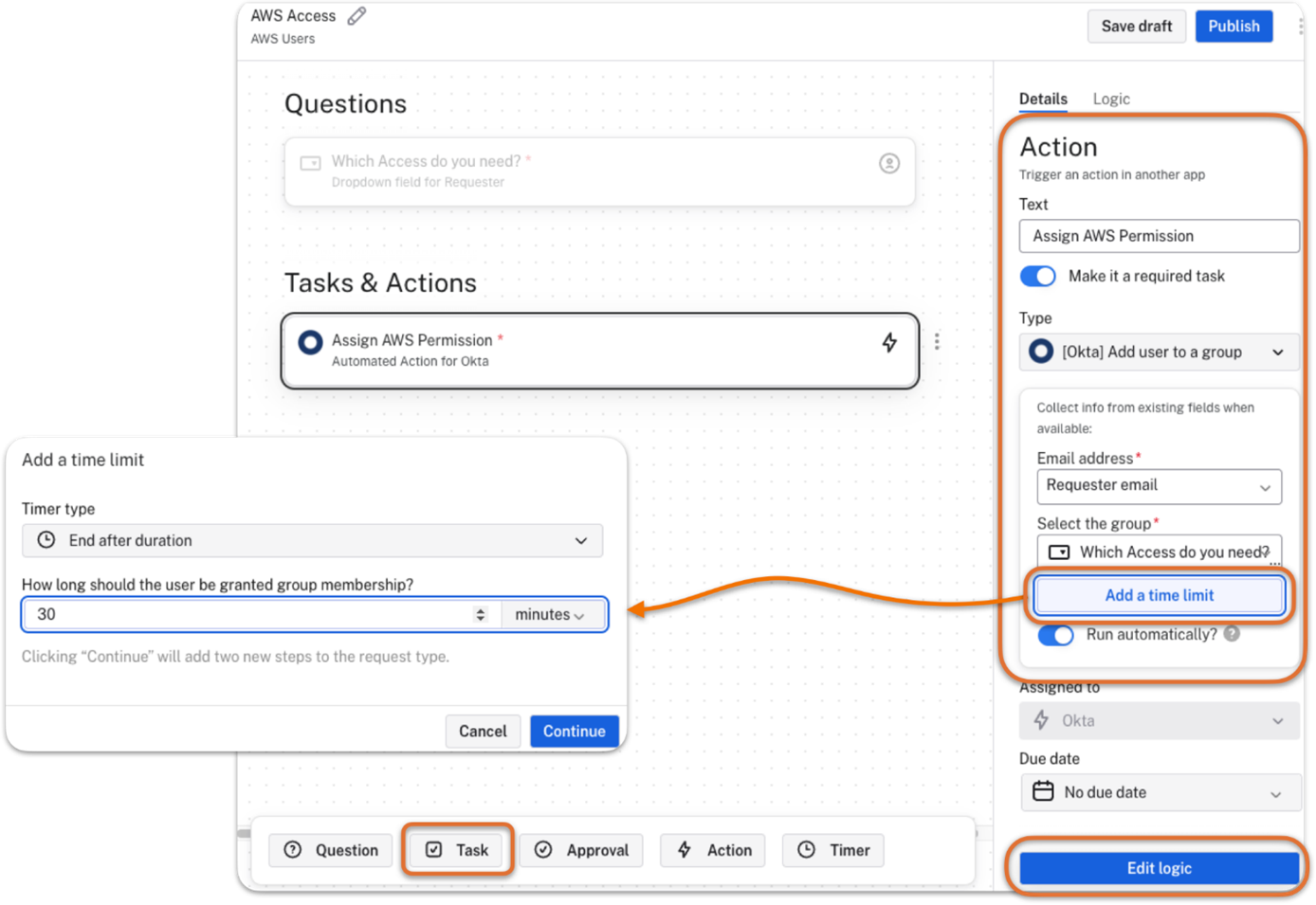 In this walkthrough, the approval is set to be automatic. However, you can configure it so specific members of your company need to first approve the request before the access takes effect. To learn more about this configuration, check the Okta help site.