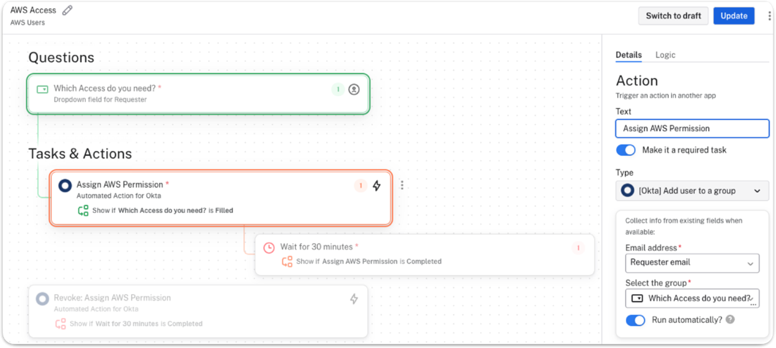 In the following steps, you’ll create the Access Request type/flow and specify which users are allowed to request access, what input they will need to provide, and the logic to route the Request.