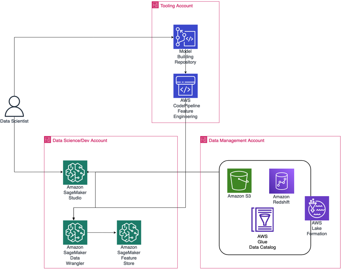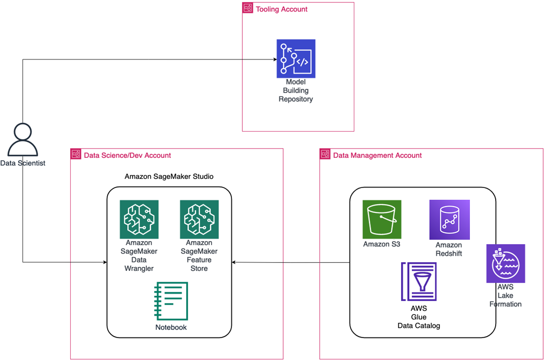The entry point is SageMaker Studio, with tailored access to services via virtual private cloud (VPC) endpoints. Here, the data scientist can use SageMaker Data Wrangler, Feature Store, and notebooks in the data science account.