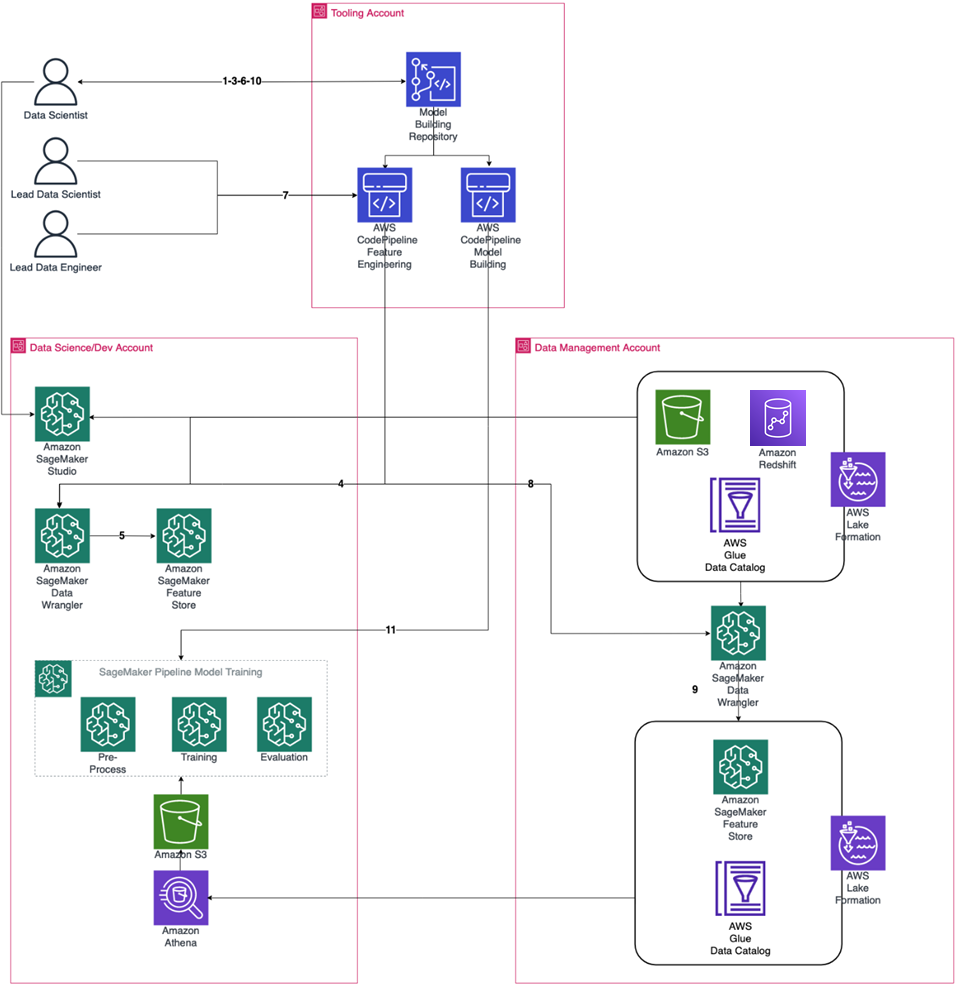 - Data science/development: Enables data scientists to conduct their research. The origin of the data snapshots is the data in the data management account. Here, experimentation is performed both with data and models.