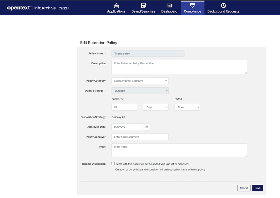 Figure 2 – Create/edit retention policy in OpenText InfoArchive.