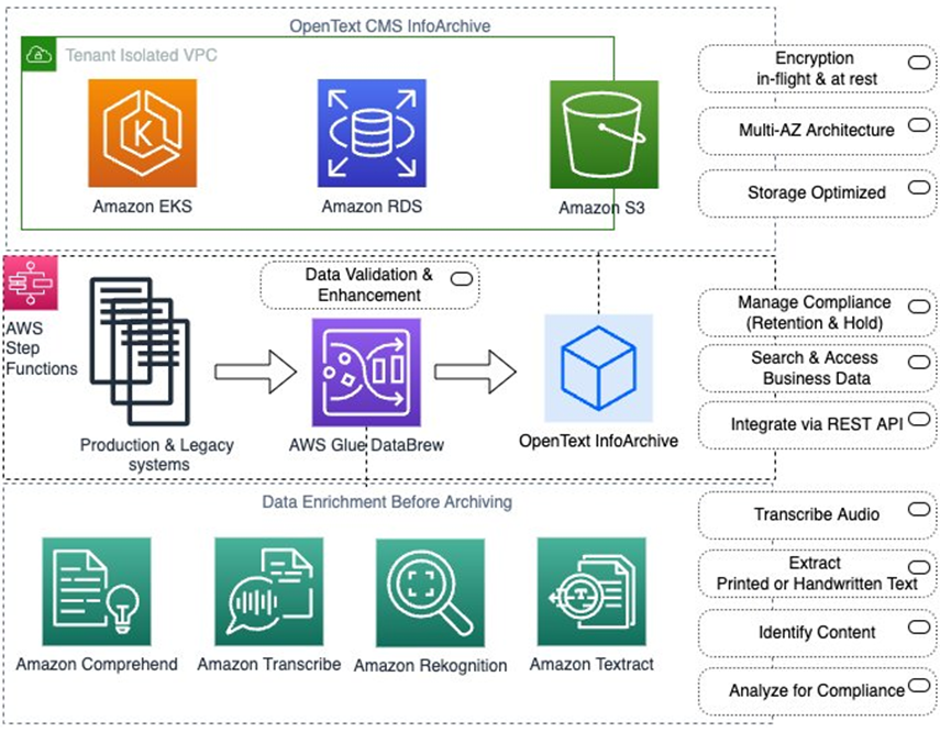 In this post, we will demonstrate how OpenText InfoArchive on Amazon Web Services (AWS) can help you take control of your “business complete data,” which refers to data that is no longer changing and needs to be kept for compliance purposes.