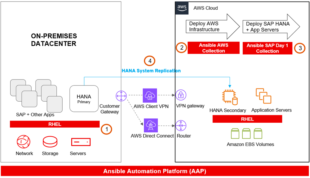For this migration scenario, it’s necessary to create a secondary SAP HANA system and set of application servers on AWS. This can be automated using the SAP Day 1 Ansible collection, as shown in Figure 4.