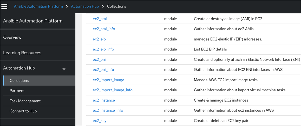 Figure 2 – Range of Ansible AWS functions available in Ansible Automation Hub.