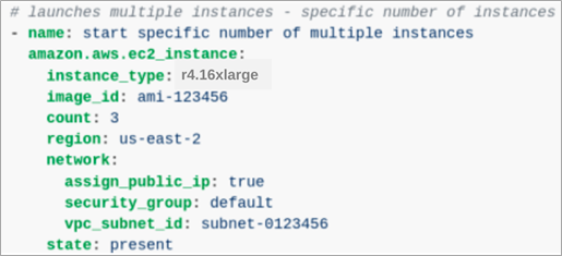 An example playbook for creating an Amazon Elastic Compute Cloud (Amazon EC2) instance is available in the community version of the Ansible documentation. Below is an example of the Ansible code.