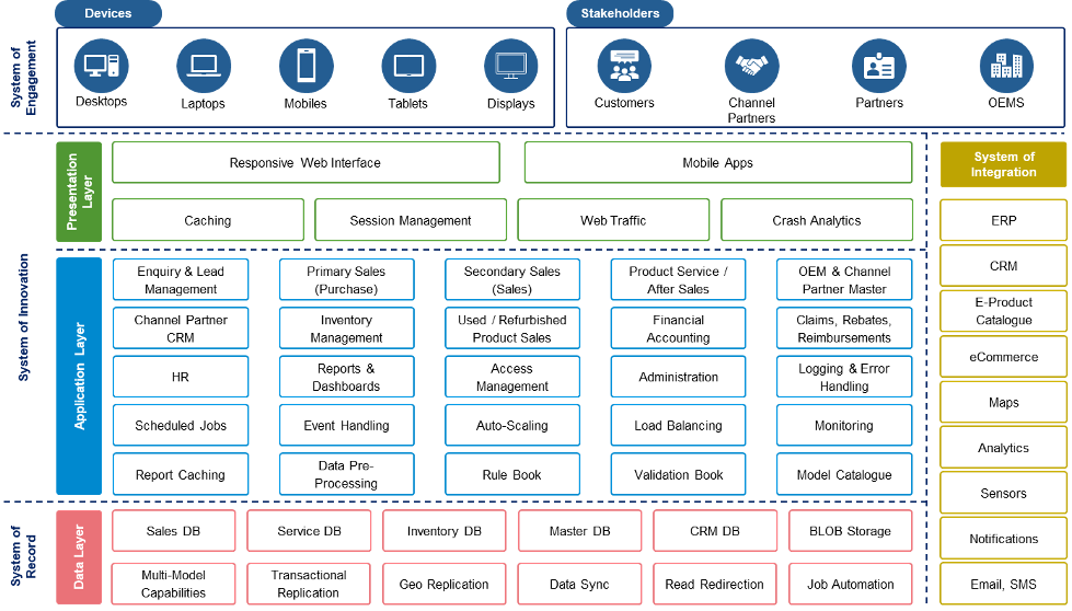 - Integrated system: A platform app connecting stakeholders like original equipment managers (OEMs), vendors, channel partners, influencers, and consumers to provide an integrated experience; unlike traditional siloed or partially connected DMS systems.