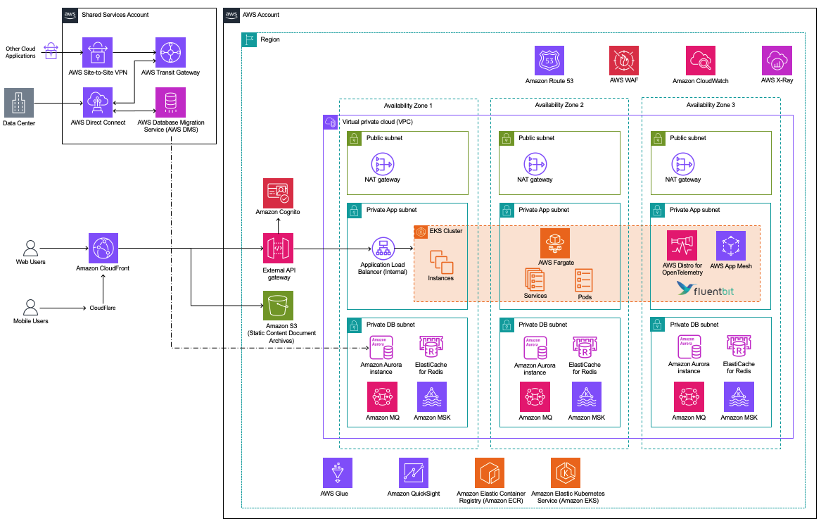 The network layer is constructed utilizing Amazon VPC, AWS Direct Connect (dedicated connectivity to other on-premises corporate applications), Amazon Route 53 (DNS), AWS Transit Gateway, AWS NAT Gateway (outbound internet traffic), Elastic Load Balancing (Layer 4 and Layer 7 load balancing), Amazon CloudFront for low latency content delivery (CDN), and AWS Site-to-Site VPN.