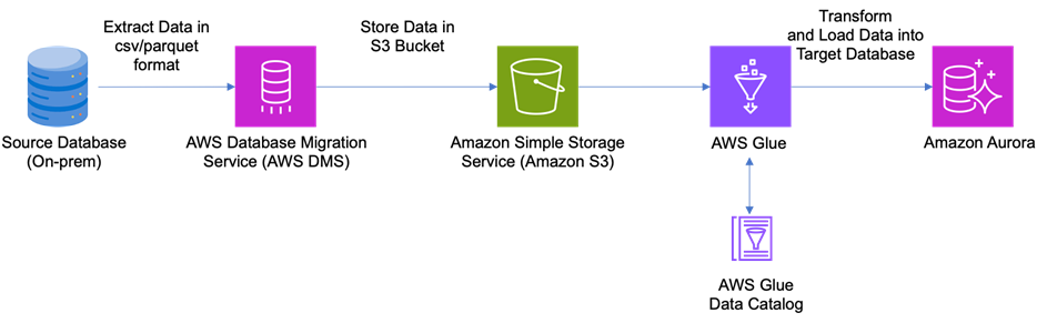 Data migration is a crucial process for successful cloud deployments, requiring consideration of factors like data types, volume, and available network resources. The data migration architecture is presented, leveraging AWS Database Migration Service (AWS DMS) and AWS Glue (for ETL).