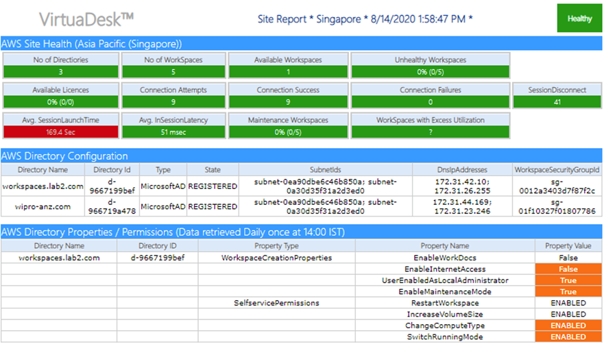Wipro virtuadesk Global Health Monitoring provides overall health status of Amazon WorkSpaces and Amazon AppStream 2.0 infrastructure in a single pane of glass.