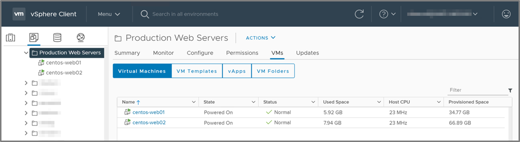 In our VMware Cloud on AWS environment, the vCenter console shows our two web server VMs, centos-web01 and centos-web02, sitting in the “Production Web Servers” folder, as shown in Figure 2.