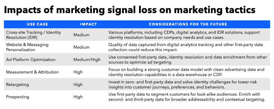 For marketers, it is difficult to understand how these changes impact their ability to reach audiences and measure impact. Not only will signal loss bring ad effectiveness challenges with personalization and audience targeting, but there will be substantial impacts to campaign measurement and attribution. Below are some expected impacts on signal loss and considerations that marketers should consider reducing the impact on their business.