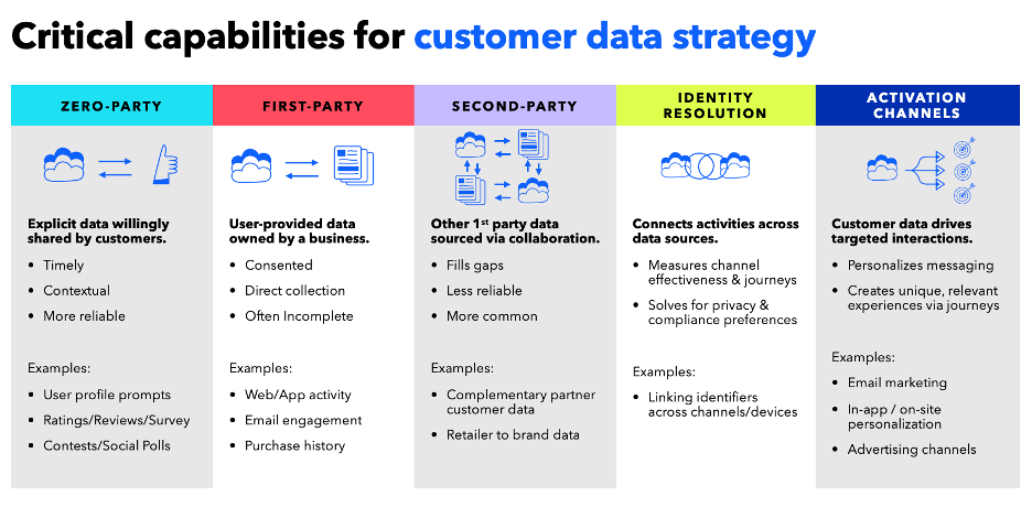 Depending on the amount of zero and first-party data that a company gathers, or if there is a desire to build a larger addressable audience, marketers may choose to supplement their first-party data with second-party data through a trusted partnership around the data exchange. As marketers develop their customer data strategies accordingly, effective identity resolution solutions become crucial. They must enable the integration of customer identities across their journey and facilitate accurate measurement of performance across various activation channels. Below is a framework for marketers looking to build up their customer data strategy to capture key data on customers for segmentation and activation: