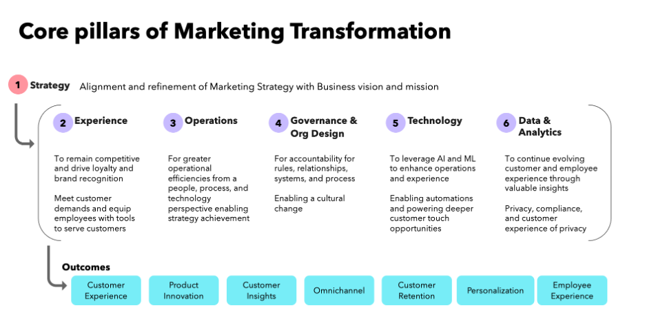 Slalom’s marketing transformation framework focuses on aligning the five pillars (Experience, Operations, Governance & Org Design, Technology, and Data & Analytics) to the overall marketing and enterprise strategy.