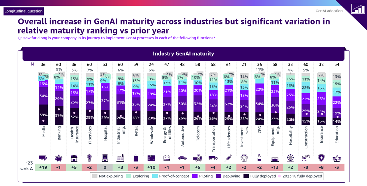The research reveals that generative AI adoption is increasingly following industry-specific patterns rather than universal use cases across sectors. This suggests that industry leaders are creating adoption blueprints around sector specific use cases rather than generic, horizontal use cases.