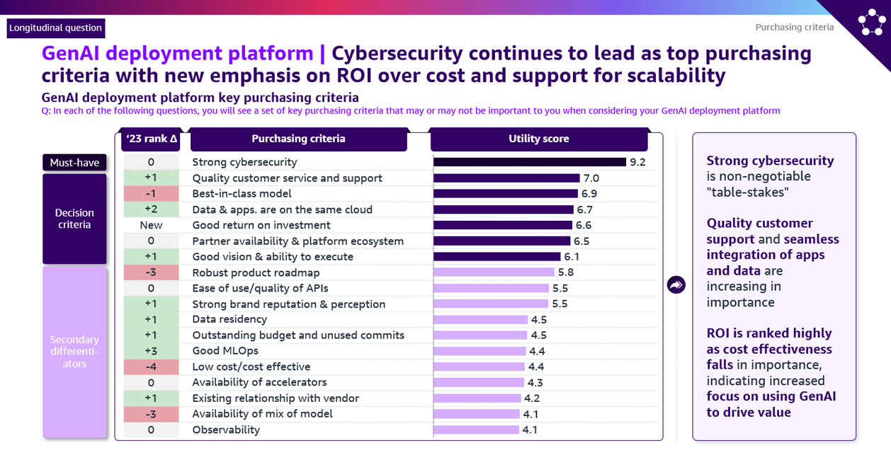 Compared to our 2023 study, while cost considerations have become less critical for initial experimentation, they remain the primary factor when scaling workloads. ROI has gained importance as the technology matures, while strong cybersecurity continues to be the leading factor in platform selection for a second year in a row.