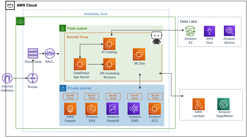 The diagram in Figure 1 below illustrates how DataRobot works with AWS, while the following list describes the different components of the solution. For this post, we’ll consider this a single account deployment architecture.